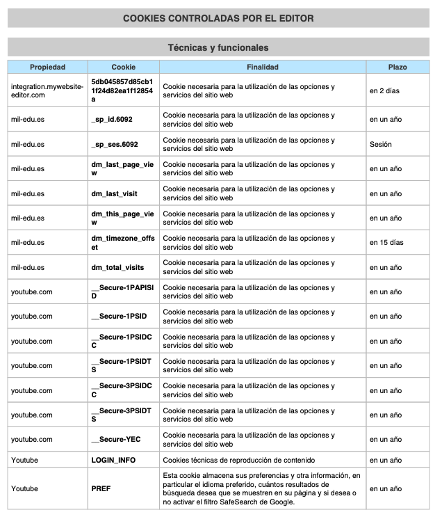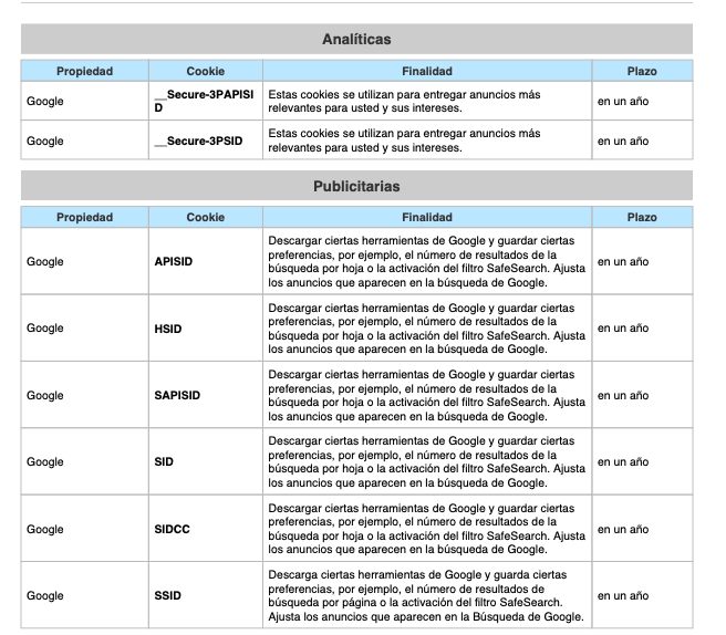 COOKIES UTILIZADAS EN ESTE SITIO WEB